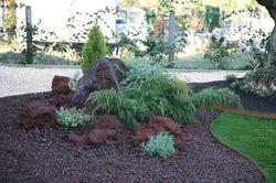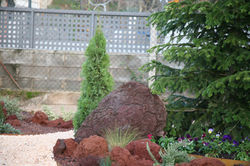 la pedra utilitzada per tot el jardí va esser la pedra volcánica de diferntes mides simulamt un "mal pais" o paisatje de les zones volcániques, i fent unes pinzellades amb la pedra volcánica mes petita. Tota la combinació es modulada per voreres de ferro Corten i dibuixant unes pinzellades verdes amb la gespa artificial.